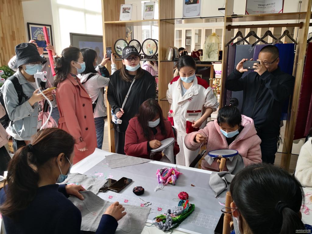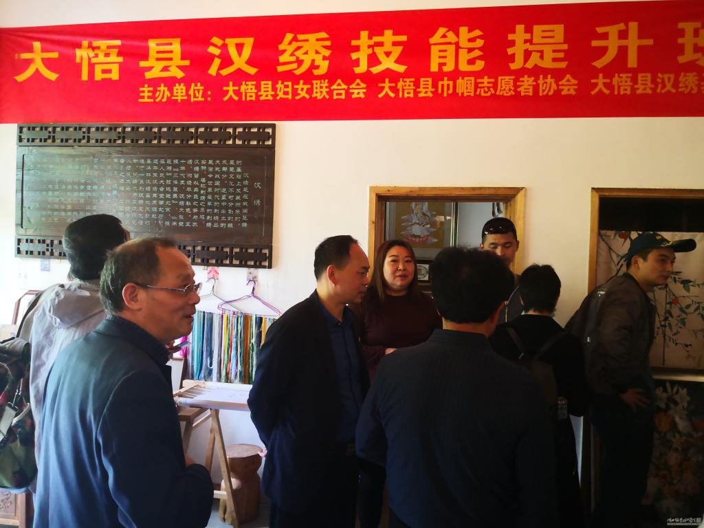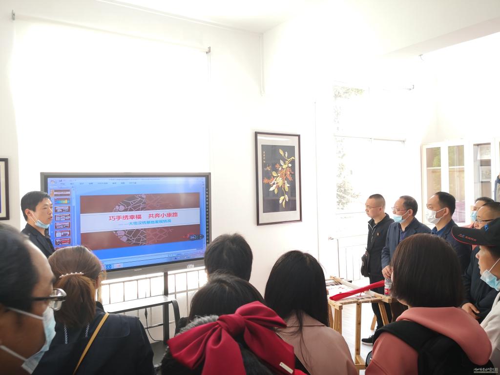 随后,为了将对接大悟汉绣产业项目落到实处,大家到大悟汉绣产业研究院及金岭村汉绣产业基地进行了实地教学活动。活动现场,大家了解了大悟汉绣的发展历史,观摩了绣娘的现场刺绣,参观了大悟汉绣的优秀作品。围绕汉绣的市场推广及汉绣人才培养等问题,到场师生和现场工作人员展开的热烈探讨,对汉绣产业发展中遇到的实际困难把脉问诊,献言献策,本次学习引发了“一村多”学员对大悟汉绣的浓厚兴趣,为后续学校汉绣课程的开设打下了良好的基础。
