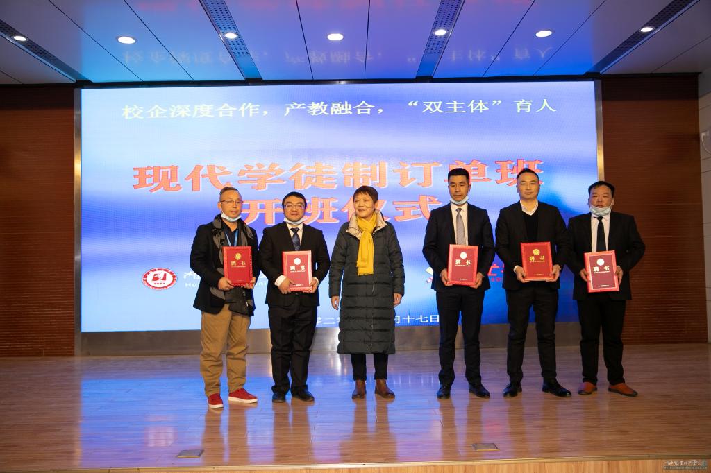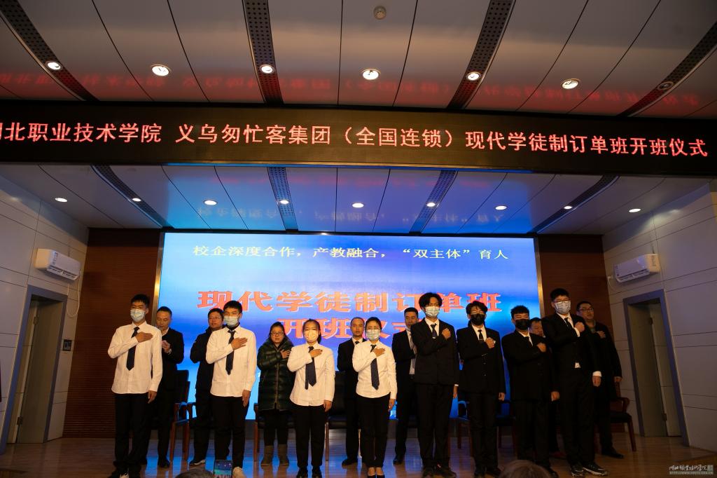 开班仪式上,学校副校长梅重、义乌匆忙客集团人力资源副总经理贺红兵分别致辞,球王会体育院长徐斌华介绍了订单班相关情况,校长朱虹向匆忙客集团相关同志颁发了客座教授聘书,匆忙客集团盛等财副总经理向学校教师发放企业管理顾问聘书,举行了拜师礼等。