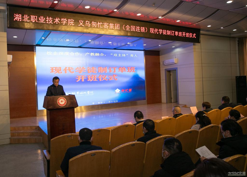 12月17日下午,学校与义乌匆忙客集团“现代学徒制”订单班开班仪式在文博馆学术报告厅顺利举行。浙江义乌匆忙客集团管理团队盛等财副总经理一行6人,学校校长朱虹、副校长梅重、相关职能处室负责人,球王会体育、旅游与酒店管理学院师生代表等参加了相关活动。学校教务处处长黄享苟主持开班仪式。