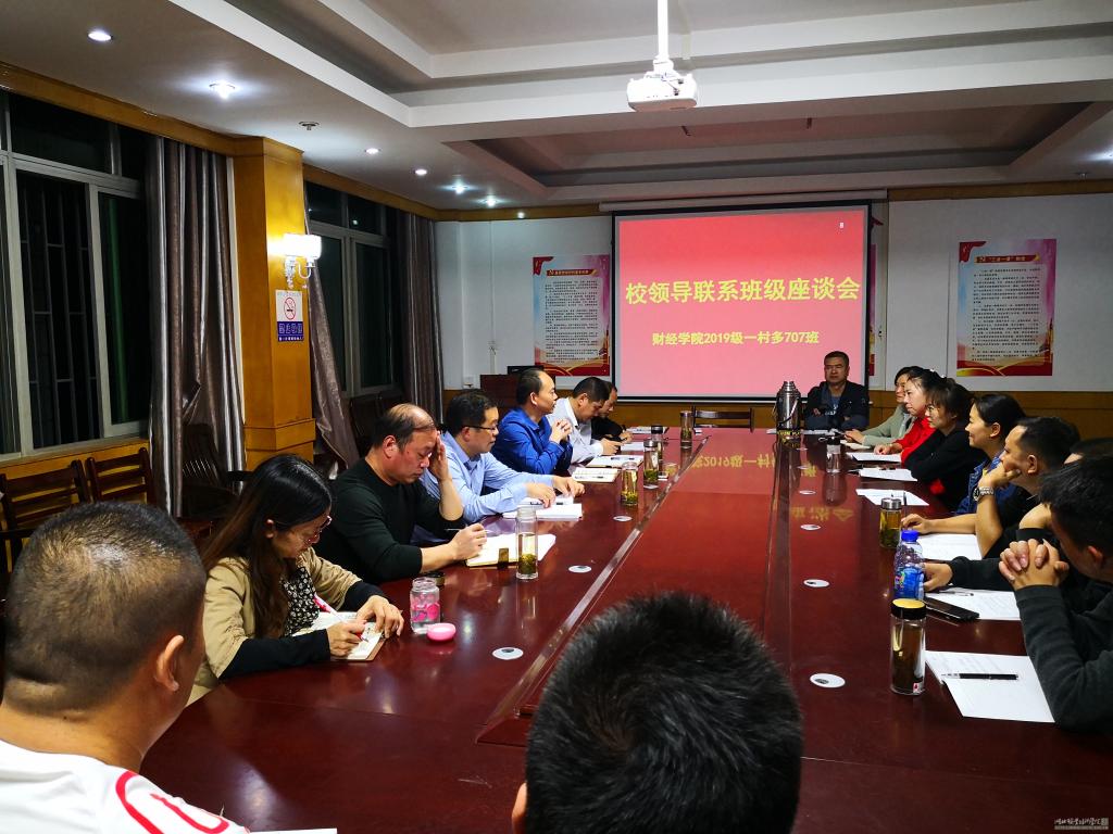 2019年10月22日,是球王会体育2019级一村多新生开课的第一天,为了切实了解一村多新生学习情况,帮助学员解决实际困难,结合“勿忘初心 牢记使命”主题教育活动的部署和要求,球王会体育于当日晚七点,在文华楼二楼会议室召开2019级一村多电子商务707班校领导联系班级座谈会。出席此次座谈的有学校党委成员梅重副校长、球王会体育全体班子成员及部分教师代表,1904707班全体在校学生参加了此次座谈。