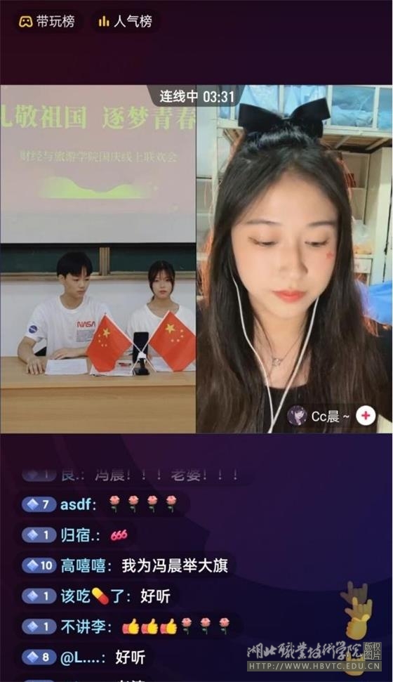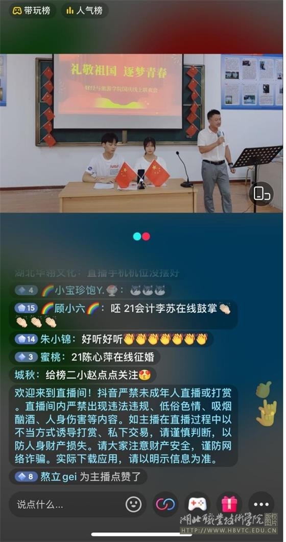 为热烈庆祝新中国成立73周年华诞,进一步激发学生爱国情怀,引导学生牢记时代使命,以不变初心永铸中华魂,迎风踏浪追逐中国梦,10月2日晚,我院隆重举办了“礼敬祖国,逐梦青春”国庆线上联欢会。此次联欢会通过“湖职财经与旅游”抖音官方账号与老师、学生相约“云端”,欢度国庆佳节。