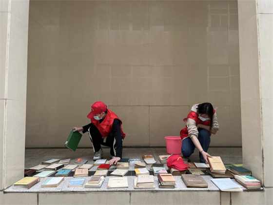 活动中,身穿红马甲的志愿者们首先化身“书农”,将图书一摞一摞地抱进阳光底下,一本一本小心翼翼的擦拭干净,分门别类摆放整齐。随后大家纷纷就自己感兴趣的图书相互交流心得、分享体会,氛围十分融洽。
