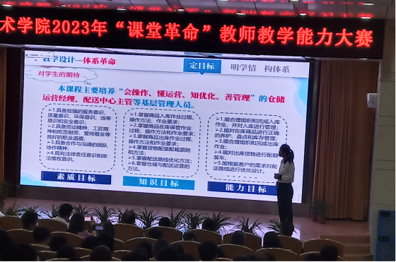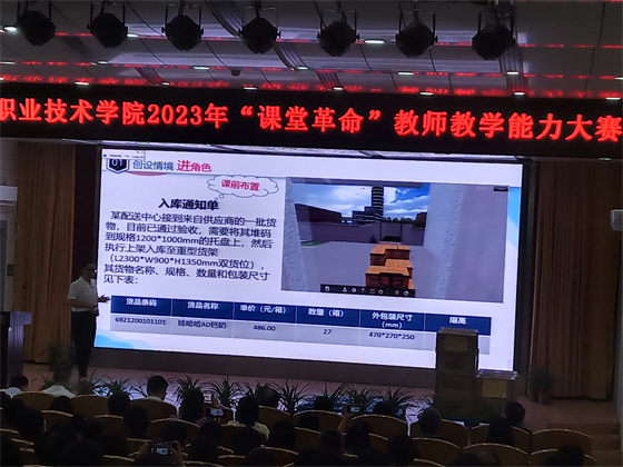 整个比赛分为2个环节,首先是说整门课教学设计5分钟。肖敏晨老师围绕打造“有用、有趣、有景、有效”四有课堂,从体系革命、方法革命、课堂革命、评价革命等几个方面进行阐述,图文并茂、数据说话展示了《仓储与配送管理》课程“课堂革命”的新理念、新模式以及革命成效和特色创新。
