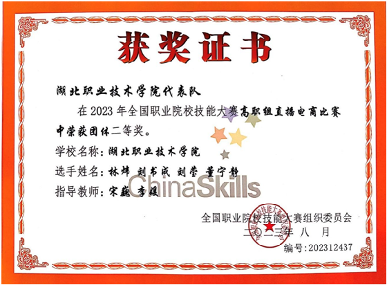 8月23日至25日,2023年全国职业院校技能大赛高职组·直播电商赛项(团体)在浙江义乌工商职业技术学院举行,来自全国的78支代表队参加了本次大赛。球王会财经与旅游学院林炜、刘书成、刘莹、董宁静4名同学代表湖北省参赛,荣获团体二等奖。