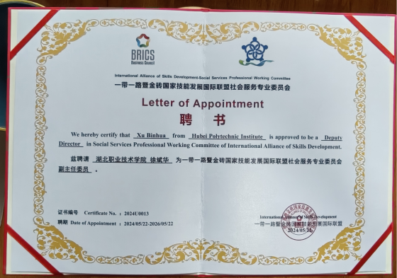 会议期间,举行了一带一路暨金砖国家技能发展国际联盟社会服务专委会成立大会,并同时发布了社会服务专业委员会2024年工作计划及产教融合项目。经过前期申请、审核,财经与旅游学院院长徐斌华、副院长曹艳芬分别受聘为一带一路暨金砖国家技能发展国际联盟社会服务专委会副主任委员和理事。