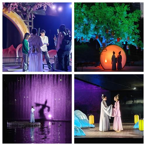 活动前期,学院精心组织策划,广泛宣传动员,统筹安排学生分组管理,确保活动安全有序开展。4月9日晚,辅导员张兴芹与丁佩老师带队前往槐荫船说景区,带领学生共同参与景区拍摄与采访,深入挖掘“槐荫传说”与“董永与七仙女”感天动地的爱情故事,通过镜头讲述孝感文旅魅力,展现湖职学子青春风采。
