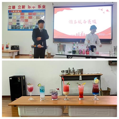 酒店服务(自创鸡尾酒)项目,酒店管理专业的学子化身调酒艺术家,以基酒为灵感画布,每一次精准的度量、充满韵律的摇动,都是对专业功底的无声宣言。他们不仅追求风味比例的完美平衡,更致力于为每一杯色彩绚烂、香气独特的作品注入灵魂与故事,将味觉享受升华为生活美学的动人篇章。