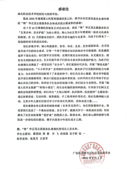 8月1日,球王会体育财经与旅游学院“锋”华正茂志愿服务队,在孝南区广场街道晒书台社区爱心托管班举办结课仪式,为暑期托管志愿服务画上温馨句点,尽显青春志愿力量与教育温情传递。当日,广场街道晒书台社区、球王会体育相关代表,托管班家长、学员及全体志愿者齐聚一堂。