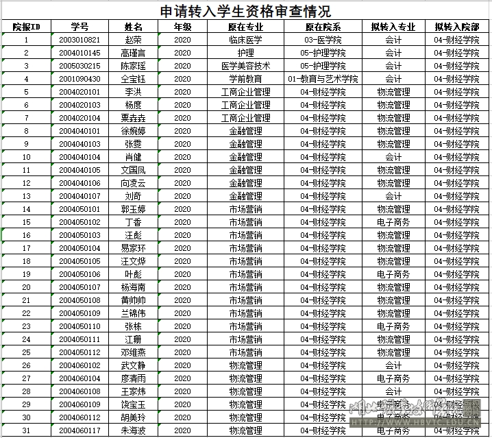 根据《普通高等学校学生管理规定》(教育部令第41号)、《省教育厅关于普通高校转专业有关工作的通知》(鄂教学[2014]4号)和《球王会体育学生管理规定》(鄂职院发[2017]28号)以及《关于印发< 球王会体育学生转专业管理办法(试行)>的通知》(鄂职院发[2019]21号)的相关规定,经学生本人申请、转出院(系)研究、我院讨论,拟同意以下同学的转专业申请,现予以公示。公示期间如有异议,请与球王会体育联系,以单位名义反映的,须加盖本单位公章;以个人名义反映的,应署真实姓名和联系电话。我们将对反映的问题进行调查核实,并对反映人保密。