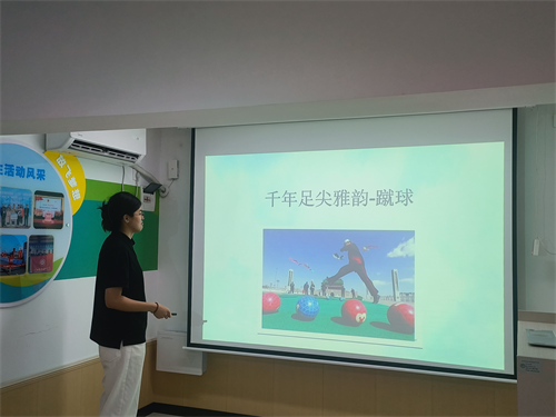 最后登场的田源同学为大家带来了关于蹴球的精彩分享。她首先介绍了蹴球这项运动的悠久历史及其蕴含的传统文化价值。随后,通过播放球王会在2023年孝感市运动会上夺冠的比赛视频,不仅让同学们直观了解了蹴球的比赛形式,更生动展现了这项传统运动的独特魅力和技术难度。