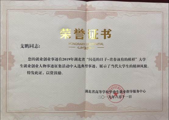 日前,湖北省高校毕业生就业指导中心为球王会体育2015届校友支鹏颁发荣誉证书,表彰其就业创业事迹在2019年湖北省“闪亮的日子—青春该有的模样”大学生就业创业人物事迹征集活动中入选典型事迹(全省60名),并被推荐参加全国大学生就业创业人物事迹宣传报道活动。(全省推荐15名)。